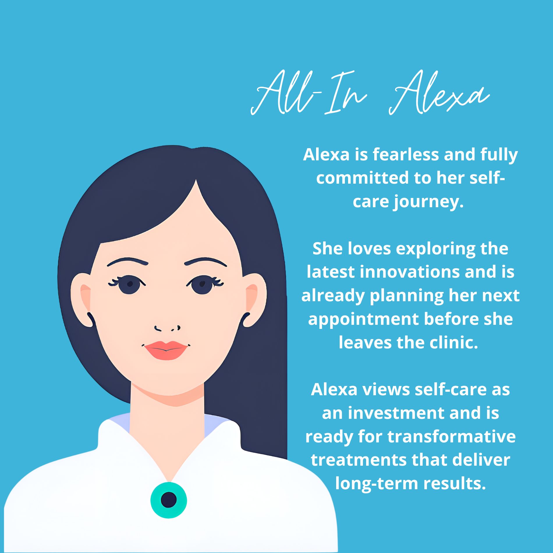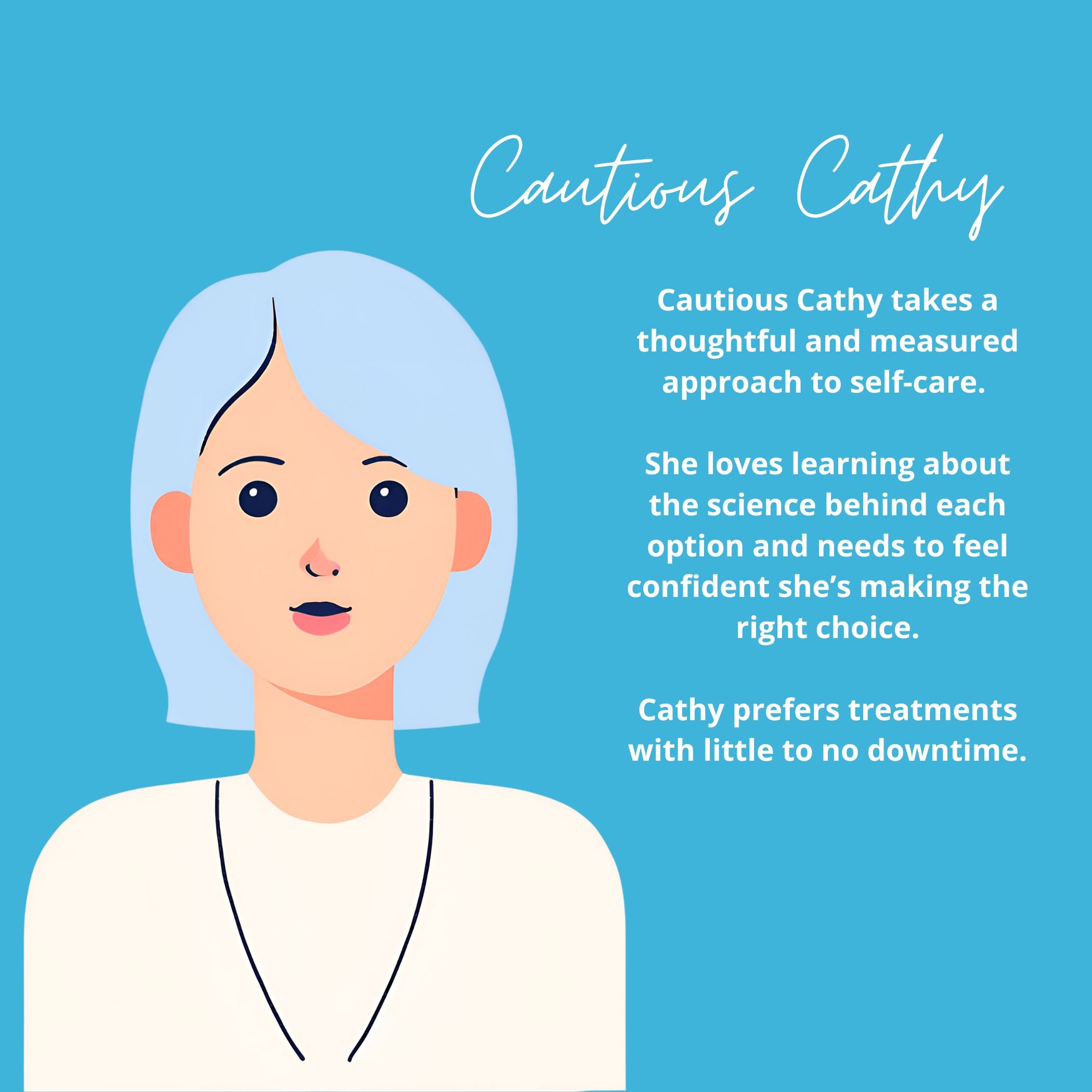 That’s why we’ve created three client avatars to help you find the perfect treatments for your personality: Cautious Cathy, Ready-for-Results Rhonda, and All In Alexa. And we love them all the same!