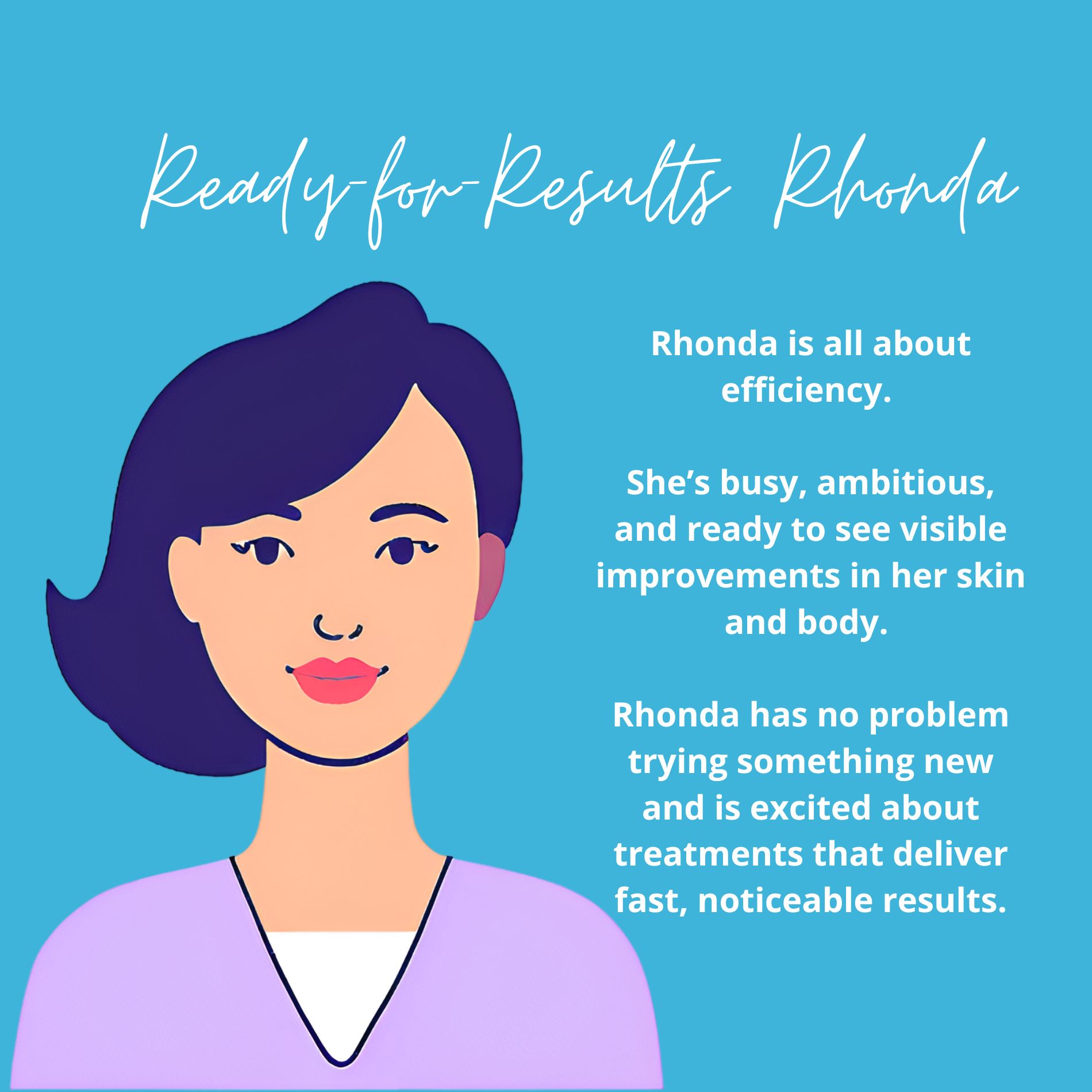 For Rhonda, we suggest treatments like Microneedling, Green Peels and Photo Facials for an instant confidence boost. Body sculpting options like BodyFX and SculpSure are perfect for Rhonda, as she is looking for targeted results without downtime.